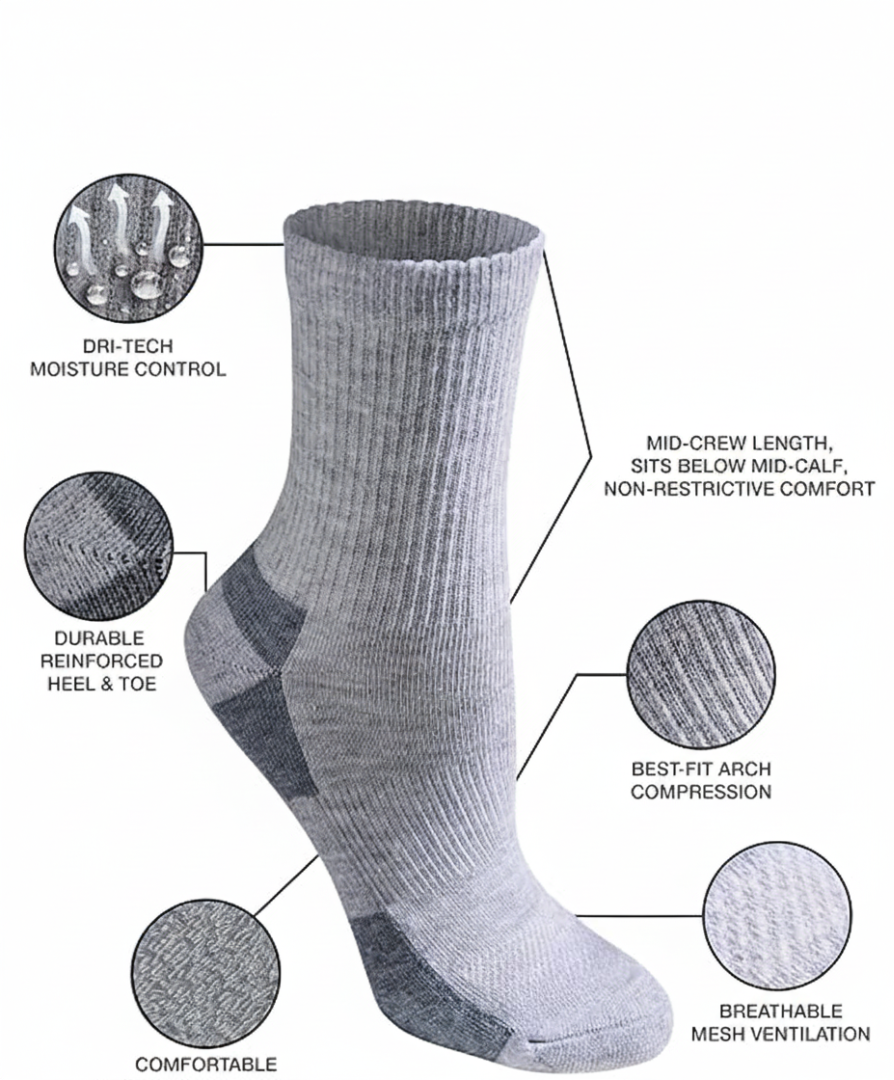 Color assortments work across training sets and casual wear. Keep darker mixes for outdoor routes and lighter mixes for indoor sessions. The mid-crew height matches most trainers and boots without excess bulk. This pack fits well in a capsule wardrobe built around sport and commute needs.