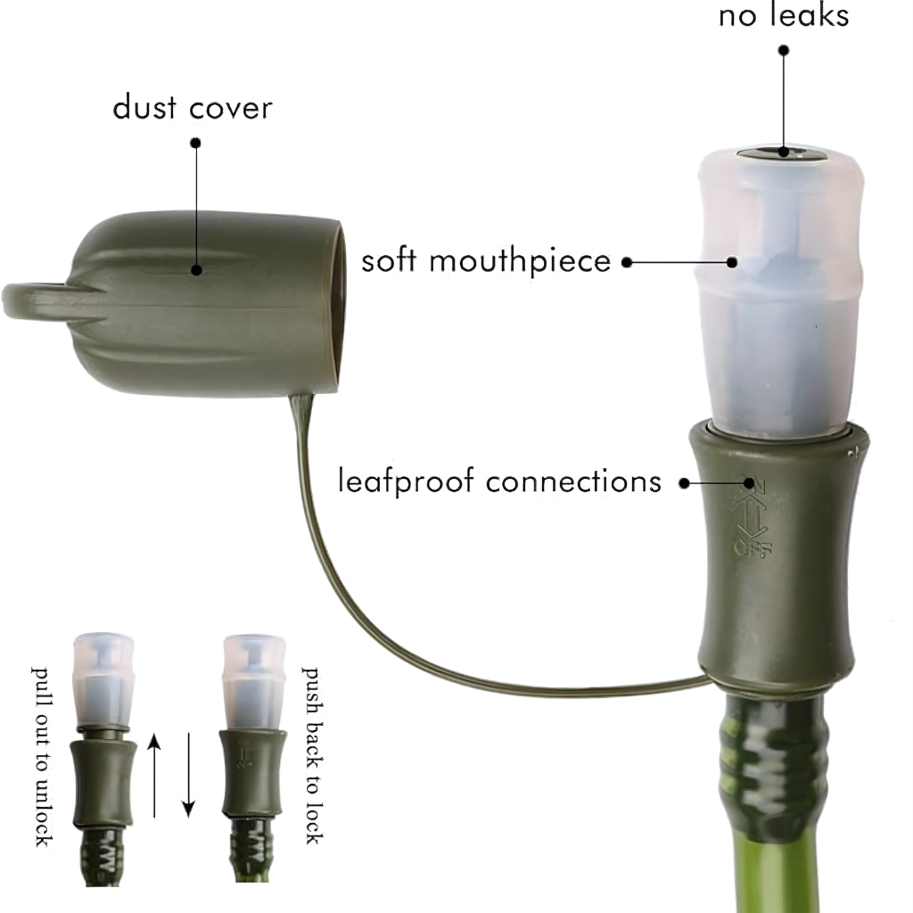 A key feature of this Outdoor Hiking Equipment item is the delivery tube. The tube reaches from the interior of the pack to the user’s shoulder area, offering water access during active motion. The mouthpiece opens when bitten and closes when released, limiting unwanted flow.