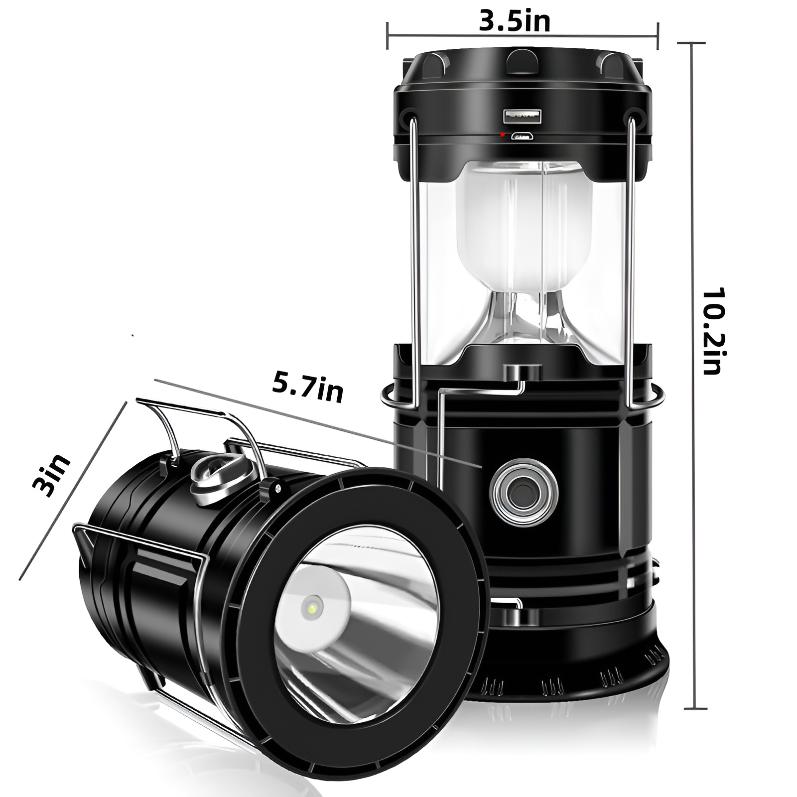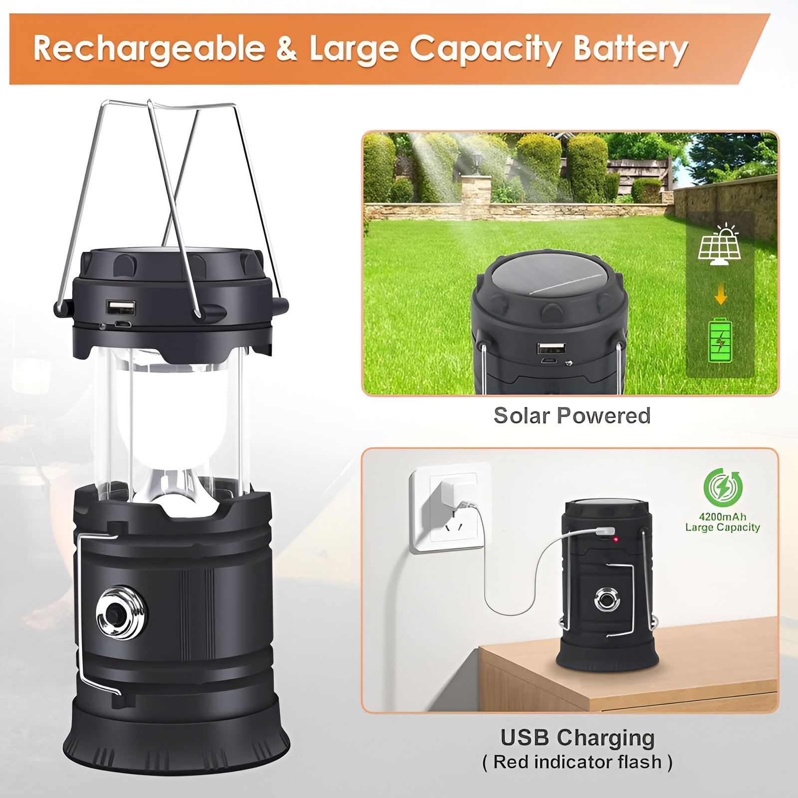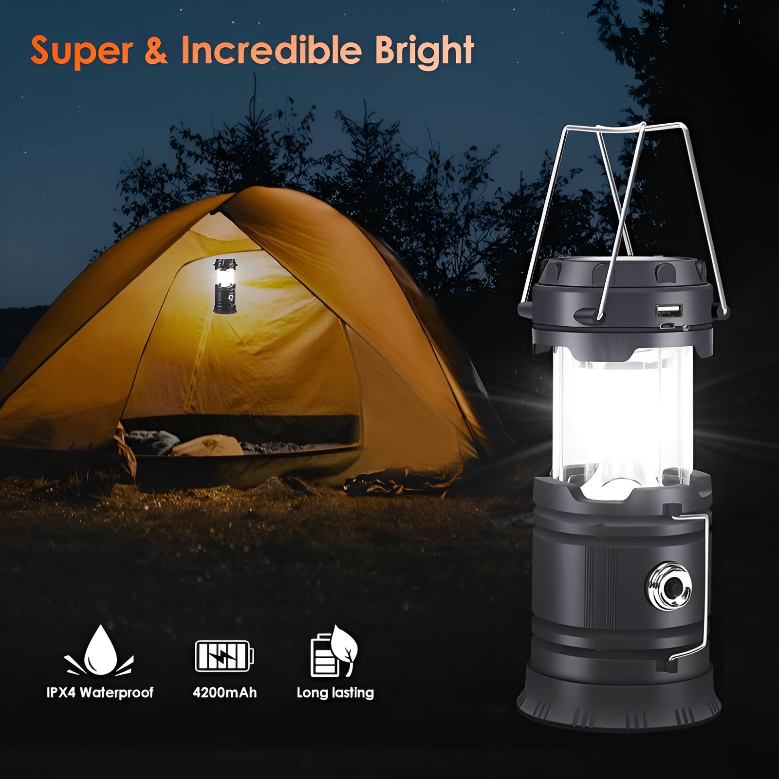 The Portable Solar USB Rechargeable Camping Lantern offers dependable illumination with adjustable brightness and dual charging options. Featuring a 4200mAh battery, USB output capability, and 360° LED lighting, it serves as both a camp light and emergency power source. Compact, portable, and practical, it is a reliable companion for outdoor adventures and unexpected power interruptions.