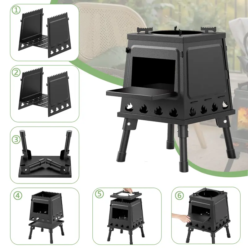 Assembly is straightforward. Attach the legs, position the stove on stable ground, and add wood fuel through the front opening. The elevated design improves airflow, supporting consistent combustion for cooking. The foldable system allows quick disassembly once cooking is complete.